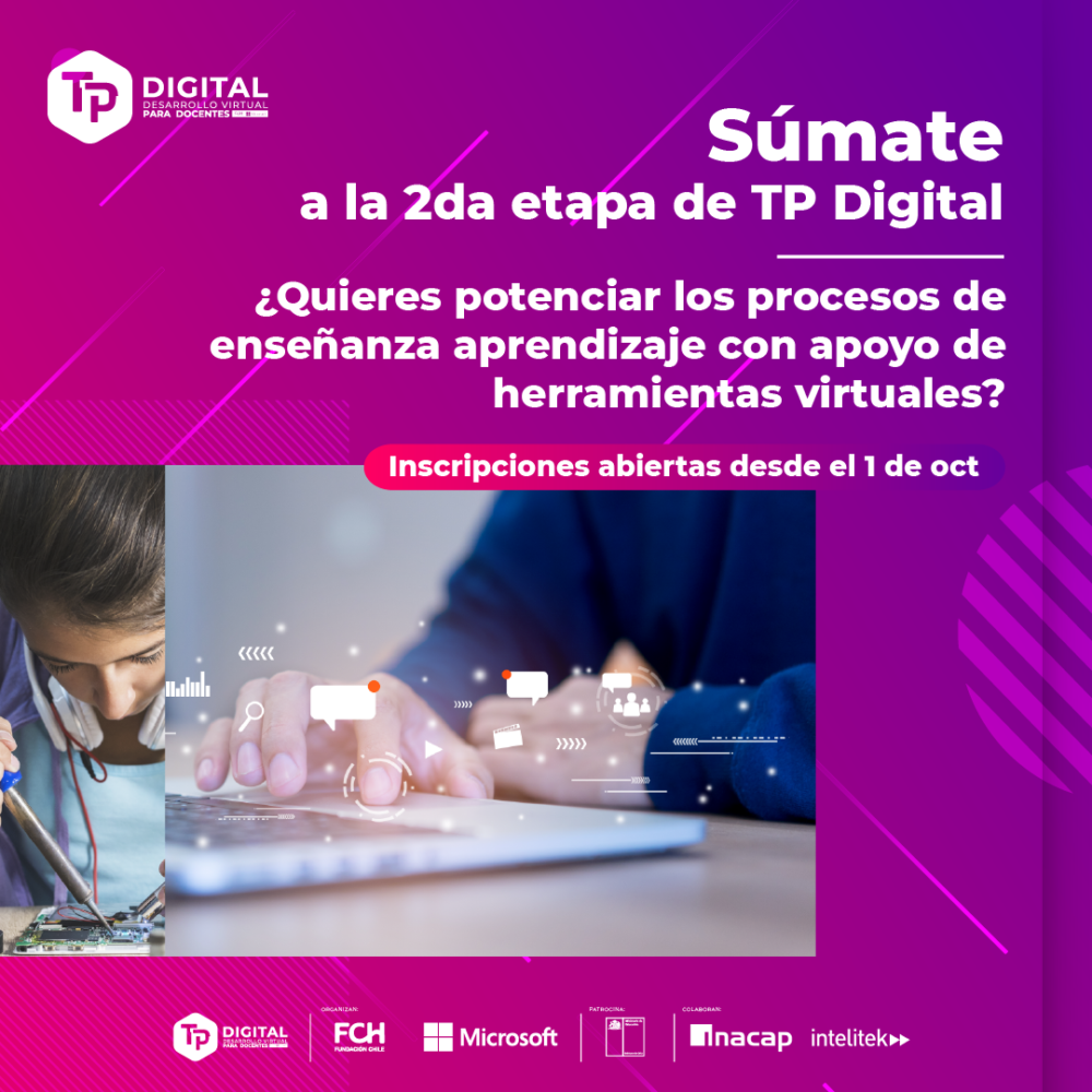 Luego de una exitosa primera etapa, Microsoft y Fundación Chile, con el patrocinio del Ministerio de Educación, abrieron las inscripciones para la segunda fase de TP Digital, programa que busca dinamizar la enseñanza técnico profesional mediante la incorporación de tecnologías en la práctica pedagógica de manera permanente.