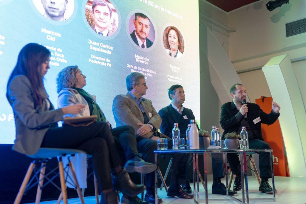 Asimismo, para profundizar en la reflexión sobre los desafíos y beneficios de la incorporación de eficiencia energética en la industria, se desarrolló un panel de conversación donde participaron actores de distintos sectores productivos: Marcos Cid, gerente de energía de Teck Resources Chile; Juan Carlos Sepúlveda, gerente general de Fedefruta, Marcel Silva, jefe de unidad de sectores productivos del Ministerio de Energía y Roxana Silva, presidenta de ANESCO Chile.