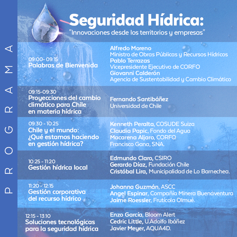 Con el interés de ayudar a dimensionar el desafío que Chile enfrenta en materia de recursos hídricos, la Agencia de Sustentabilidad y Cambio Climático y Corfo invitan a esta jornada que reunirá a 14 expositores del mundo público y privado para dar conocer experiencias, iniciativas y modelos de gestión innovadores que contribuyan a la seguridad hídrica en empresas y territorios.