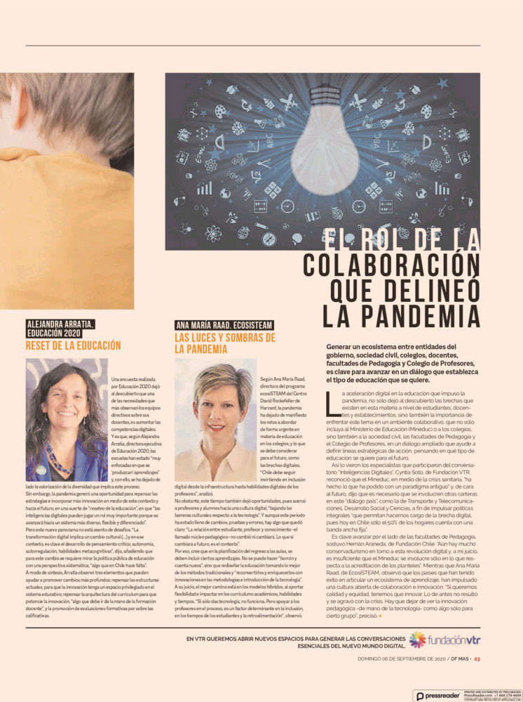 Según Ana María Raad, directora del programa ecosiSTEAM del Centro David Rockefeller de Harvard, la pandemia ha dejado de manifiesto los retos a abordar de forma urgente en materia de educación en los colegios, y lo que se debe considerar para el futuro, como las brechas digitales. «Chile debe seguir invirtiendo en inclusión digital desde la infraestructura hasta habilidades digitales de los profesores», analizó.