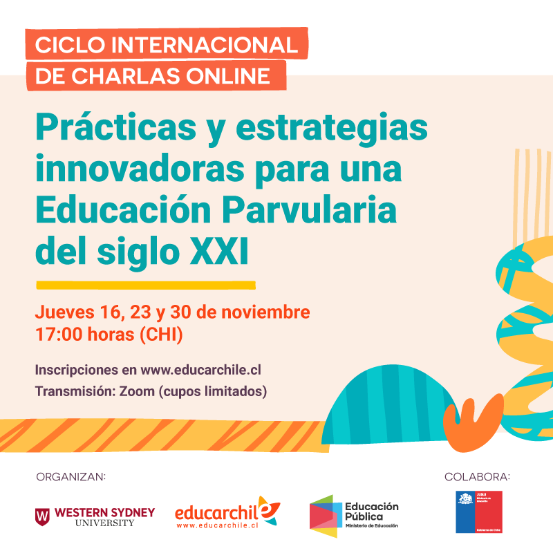 En razón de este propósito educarchile -portal educativo de Fundación Chile y el Ministerio de Educación-, la Western Sydney University (WSU) y la Dirección de Educación Pública (DEP), se unieron para organizar el ciclo internacional de charlas “Prácticas y estrategias innovadoras para una Educación Parvularia del siglo XXI”, una actividad abierta y gratuita apoyada por Junji, que tendrá lugar los jueves 16, 23 y 30 de noviembre a las 17:00 horas, por la plataforma Zoom.