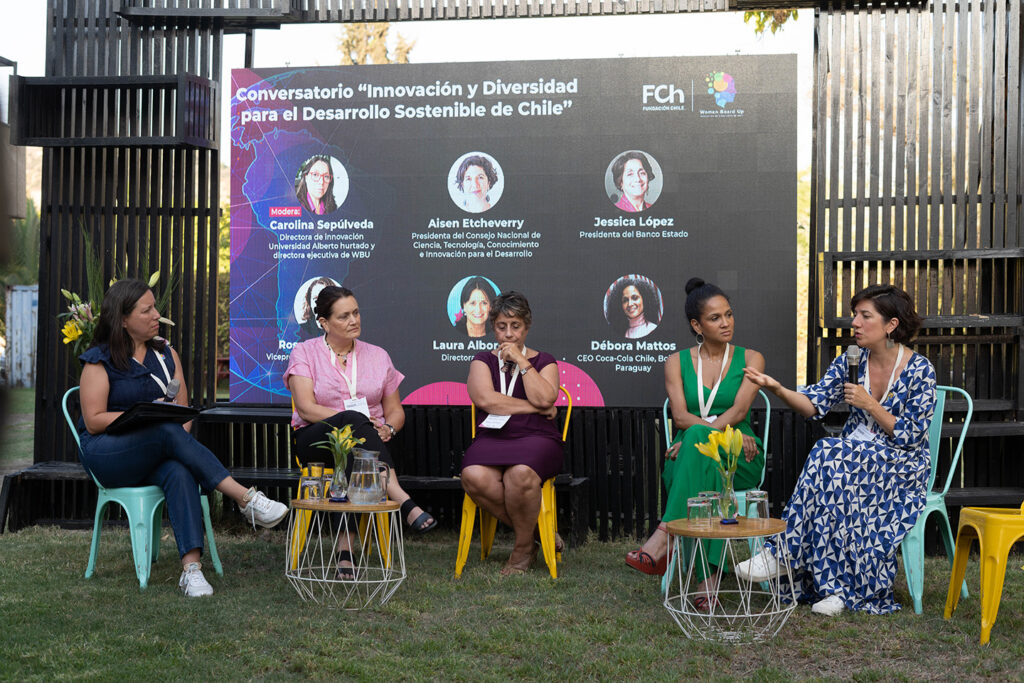 La actividad denominada “Innovación y Diversidad para el desarrollo Sostenible de Chile” contó con la participación de las hoy Ministras de Estado, Jessica López (Obras Públicas), y Aisén Etcheverry (Ciencia, Tecnología, Conocimiento e Innovación); Laura Albornoz, Directora de Enap; Debora Mattos, Gerenta General de Coca Cola Chile, Bolivia y Paraguay y Nancy Pérez, Consejera Innova Chile Corfo, y Leah Pollak, Gerente de Asuntos Corporativos entre otras.