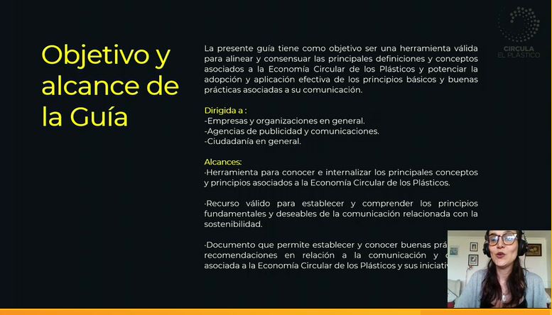 Antonia Biggs, Directora del Pacto Chileno de los Plásticos, señaló que la Guía «tiene como objetivo alinear y consensuar las principales definiciones y conceptos relacionados a la Economía de los Plásticos y potenciar la adopción de buenas prácticas asociadas a su comunicación». Entre los principios de una comunicación sostenible destacó la fiabilidad, pertinencia, claridad, y transparencia y accesibilidad”.