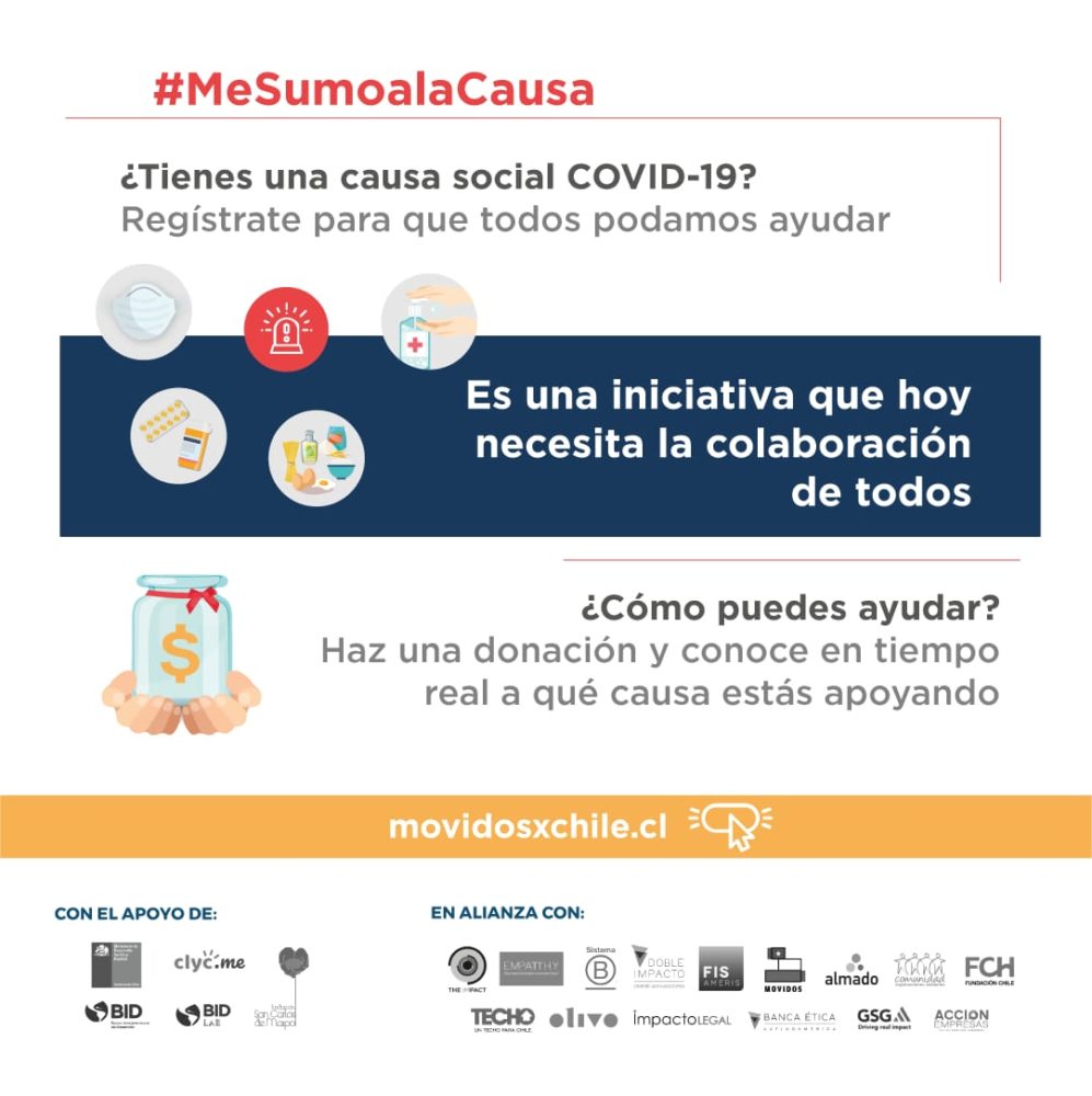 En la plataforma de la red de organizaciones de la sociedad civil, que trabaja en la gestión y coordinación de emergencias, desde hace tres años, www.movidosxchile.cl, las organizaciones podrán subir sus necesidades y las personas que decidan ayudar podrán ver en tiempo real a qué causas están aportando. De esta forma, la iniciativa que lleva por nombre “Me sumo a la causa”, busca contribuir a que las organizaciones de la sociedad civil obtengan de forma eficiente, el apoyo que necesitan consiguiendo cajas de alimentos, insumos de protección personal, o activación de grupos vulnerables para apoyar la fabricación de mascarillas, entre otros. Todo esto, con el apoyo profesional y la coordinación logística que posee Movidos x Chile; iniciativa que nace de la Comunidad de Organizaciones Solidarias, red que agrupa a más de 200 organizaciones sociales que trabajan por la pobreza y exclusión social en el país.