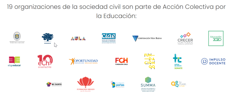 Acción Colectiva por la Educación es una alianza entre organizaciones de la sociedad civil comprometidas con una educación de calidad, equitativa e inclusiva. Esta organización busca promover un esfuerzo colectivo capaz de generar una agenda educativa a largo plazo, trabajando con el Estado, independiente del gobierno de turno, desde el conocimiento y la experiencia en terreno, para generar un cambio educativo a gran escala.