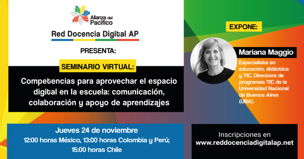 Con el propósito de profundizar en las temáticas de estos cursos el jueves 24 de noviembre la Red Docencia Digital AP realizará el seminario virtual abierto y gratuito “Competencias para aprovechar el espacio digital en la escuela: comunicación, colaboración y apoyo de aprendizajes”. Este tendrá lugar a las 12:00 horas de México; a las 13:00 horas de Colombia y Perú y a las 15:00 horas de Chile.